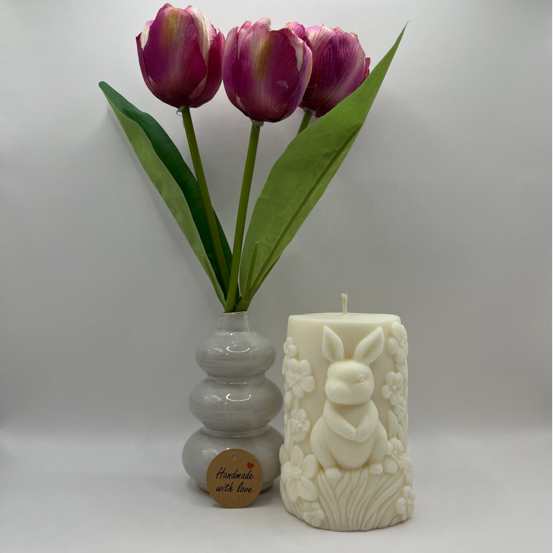 Diese Stumpenkerze vereint festliche Osterstimmung mit gemütlichem Kerzenlicht.