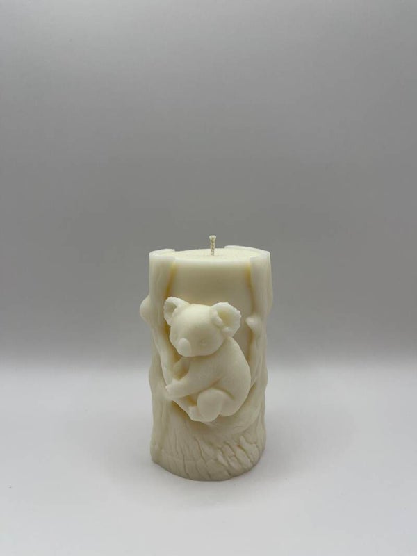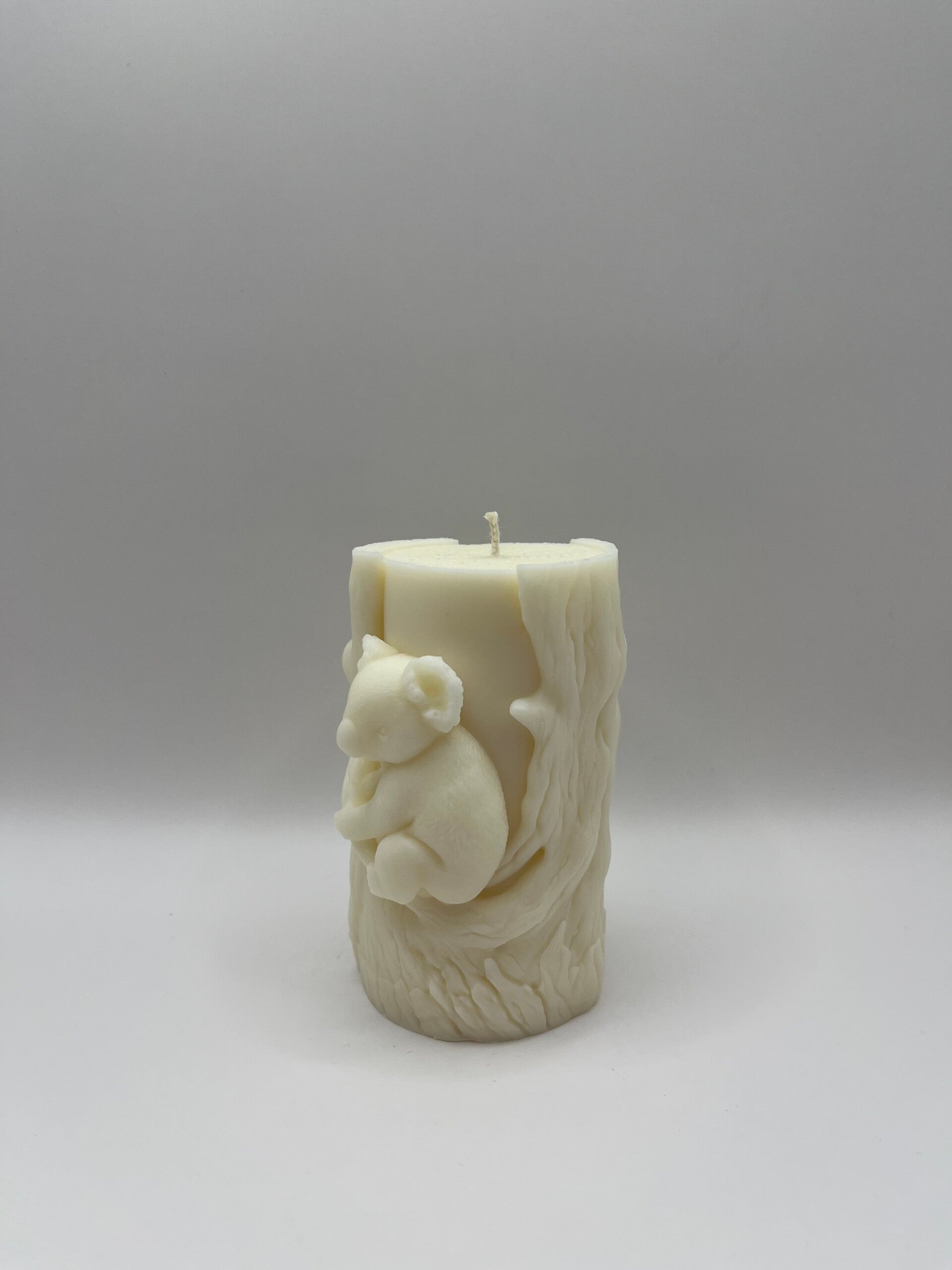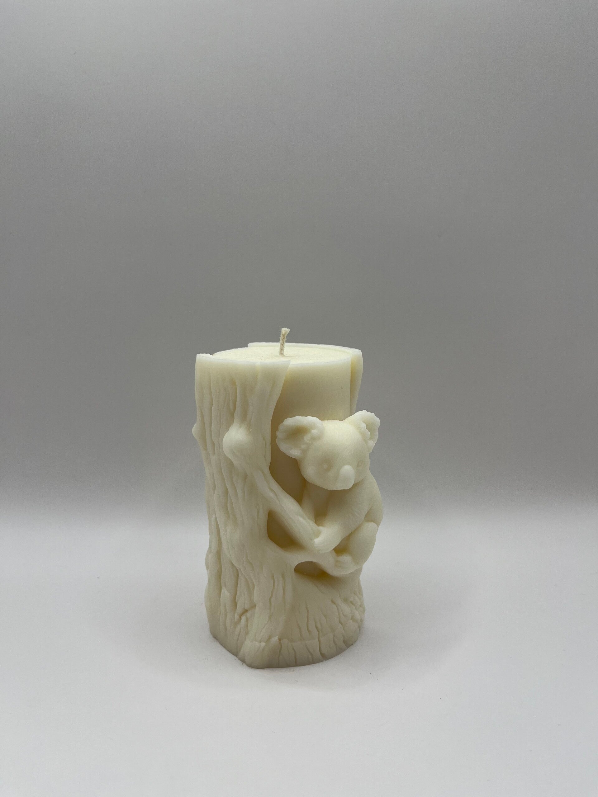Diese detailverliebte Kerze vereint die Gemütlichkeit eines kuschelnden Koalas mit der natürlichen Schönheit eines Baumstamms.