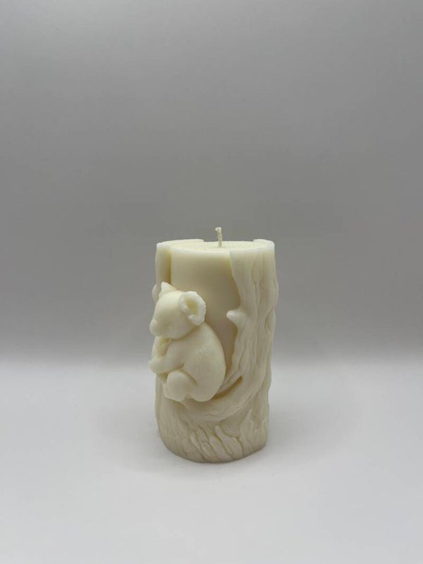 Diese detailverliebte Kerze vereint die Gemütlichkeit eines kuschelnden Koalas mit der natürlichen Schönheit eines Baumstamms.